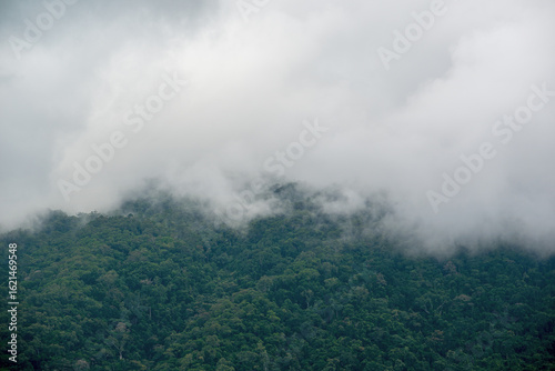 Mist shrouds the rainforest mountains north of Cairns, Queensland, creating a mystical scene where lush green peaks fade into drifting clouds, evoking the wild beauty of the tropical north.
