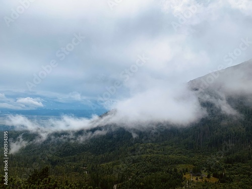 Mist-covered mountain landscape with a lush green forest below. Low clouds drift over the slopes, creating a serene and mysterious atmosphere, highlighting nature's untouched beauty.