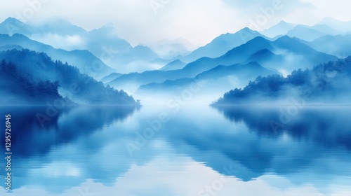 Misty Blue Mountains Reflecting on Calm Lake