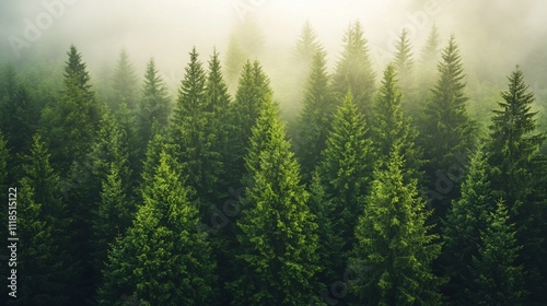 Misty forest canopy, dense evergreen trees, sunlight filtering through.