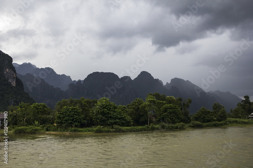 misty mountains by a river in laos