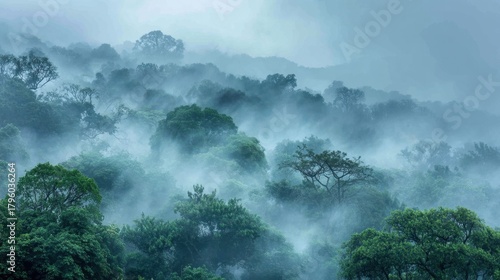 Misty Mountains in a Lush Forest with Dense Fog and Vibrant Green Trees Surrounded by Tranquil Nature and Serene Atmosphere at Dawn