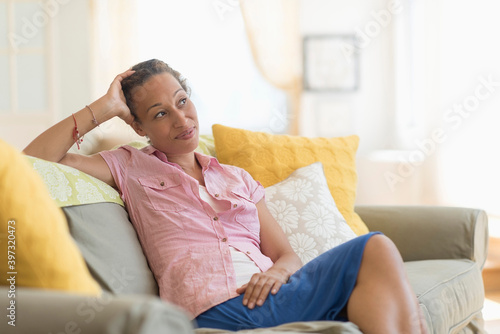 Mixed race woman smiling on sofa