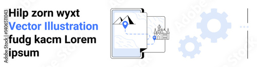 Mobile device with map screens, location pin, mountain, castle, and gears symbolizing navigation, travel, innovation, user interface design. Ideal for travel apps tech UIUX tourism exploration