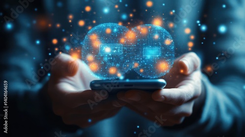 Mobile Technology Innovation: Hands Holding Smartphone with Digital Visualization
