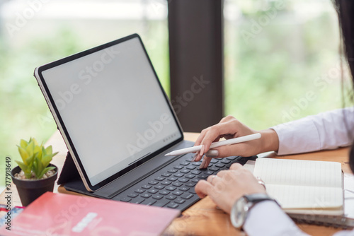 Mock up. Image of woman working with tablet with blank white screen in office.