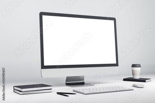 Mock up of modern computer with white screen on desktop. 3D Rendering
