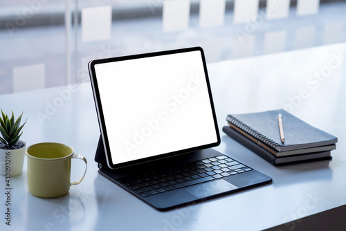 Mock up. Tablet blank white screen with coffee cup papers placed at the table.