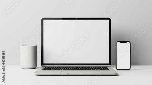 Mock up template of a laptop computer and mobile phone isolated on a white background. Blank white mockup screen for technology digital devices.