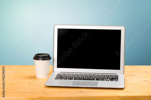 Mockup blank laptop screen with coffee on wooden table in coworking space.