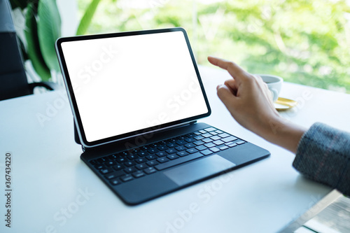 Mockup image of a woman using and pointing finger at tablet pc with blank desktop white screen as a computer pc