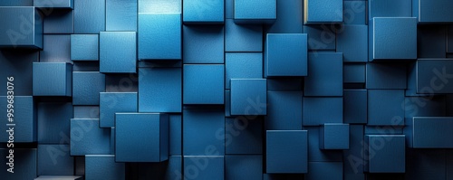 Modern 3D blue squares pattern, multi-layered with depth, sleek surfaces, cool-toned lighting. Abstract and Minimalistic Design Backgrounds