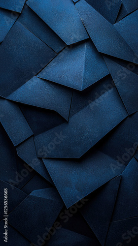 Modern abstract blue background design with layers of textured white transparent material in triangle diamond and square shapes in random geometric pattern.