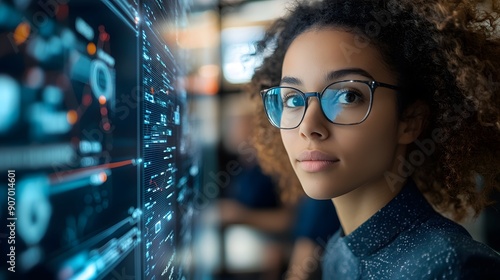 Modern AI interface displaying IT vendor risk levels, team collaborating in the background