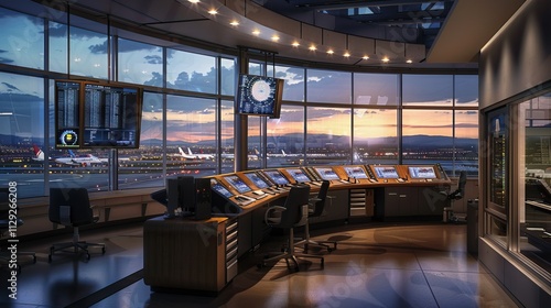 Modern Airport Control Tower Interior Overlooking Runway at Sunset