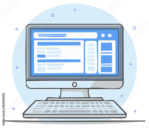Modern all in one computer illustration with a web page layout. Blue cartoon desktop with keyboard for office or technology.