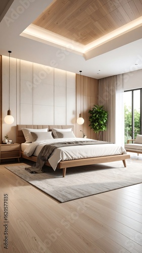 Modern bedroom with natural light and wood accents