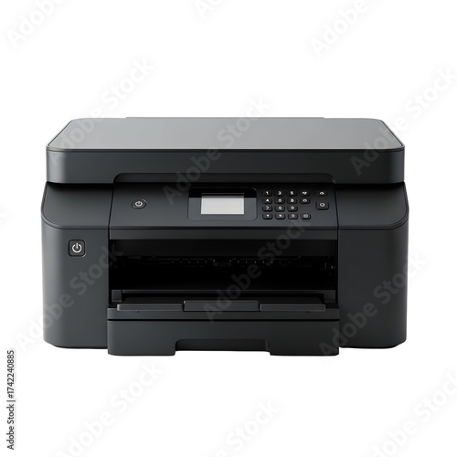 Modern black multifunction printer with transparent background