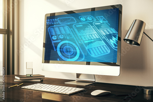 Modern computer display with abstract graphic data spreadsheet sketch, analytics and analysis concept. 3D Rendering