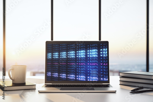 Modern computer display with abstract graphic data spreadsheet sketch, analytics and analysis concept. 3D Rendering