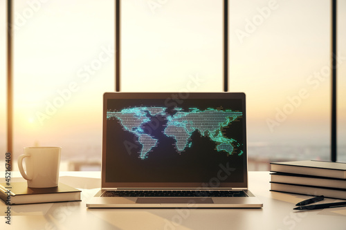 Modern computer display with abstract graphic world map, big data and networking concept. 3D Rendering