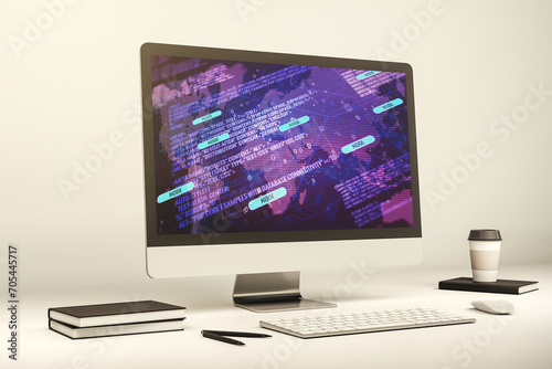 Modern computer display with abstract programming language hologram and world map, artificial intelligence and neural networks concept. 3D Rendering