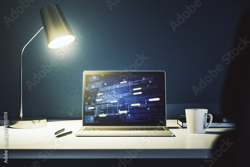 Modern computer display with abstract programming language hologram, artificial intelligence and machine learning concept. 3D Rendering