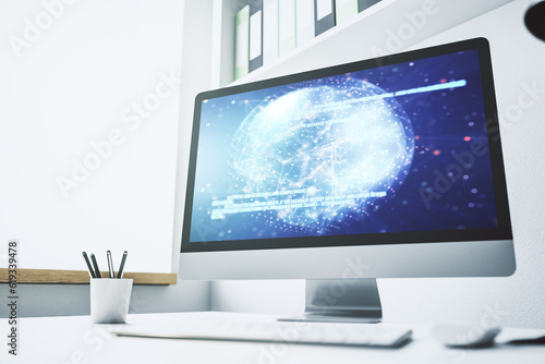Modern computer display with abstract software development hologram and world map, global research and analytics concept. 3D Rendering