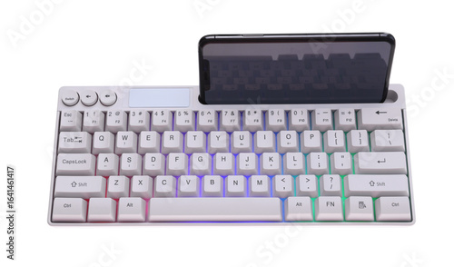 Modern computer keyboard with RGB lighting and smartphone isolated on white, above view