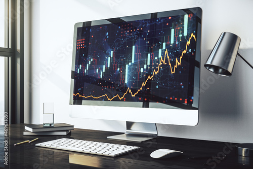 Modern computer monitor with abstract creative financial chart, research and strategy concept. 3D Rendering