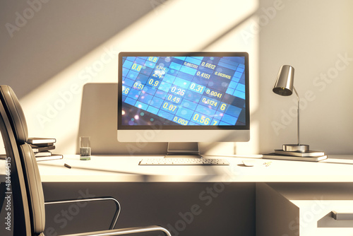 Modern computer monitor with abstract statistics data hologram interface, computing and analytics concept. 3D Rendering