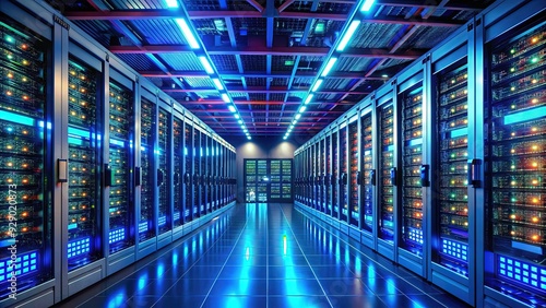 Modern computer network server room filled with rows of humming machines and blinking lights, symbolizing high-tech data processing and advanced digital infrastructure.