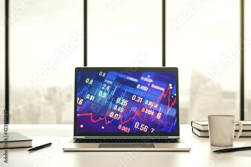 Modern computer screen with abstract creative financial chart, research and analytics concept. 3D Rendering