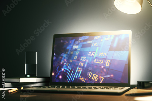 Modern computer screen with abstract creative financial chart, research and analytics concept. 3D Rendering