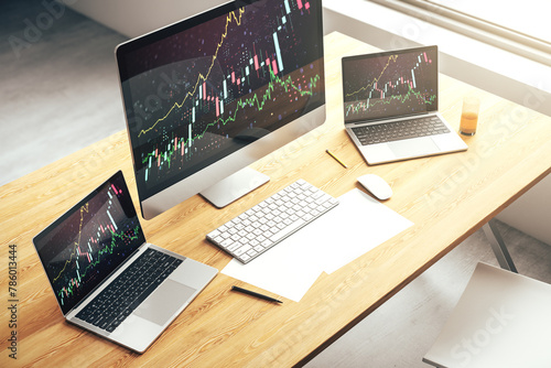Modern computer screen with abstract creative financial chart, research and analytics concept. 3D Rendering