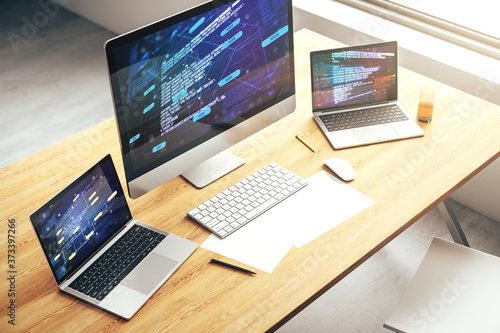 Modern computer screen with abstract graphic coding sketch, big data and networking concept. 3D Rendering