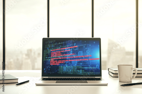Modern computer screen with abstract graphic coding sketch, big data and networking concept. 3D Rendering
