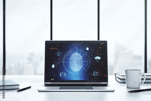 Modern computer screen with creative fingerprint hologram, personal biometric data concept. 3D Rendering