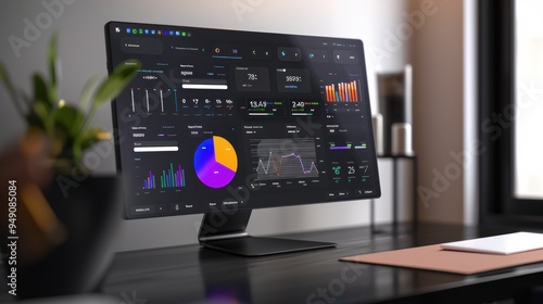 Modern computer showing graphs and charts on a desk in an office at home