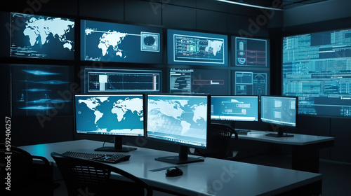 Modern control room. Multiple Personal Computer Monitors Showing Coding Language Program with System Monitoring Interface. Generative AI