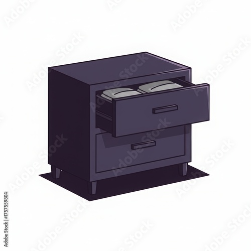 Modern dark wood nightstand with open drawer revealing stored items on a white background