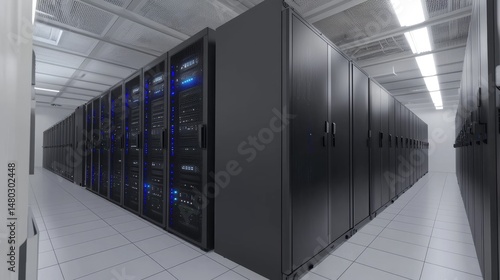 Modern data center corridor with high-capacity server racks under bright white ceiling lights, ideal for illustrating IT infrastructure, networking, and cloud storage systems