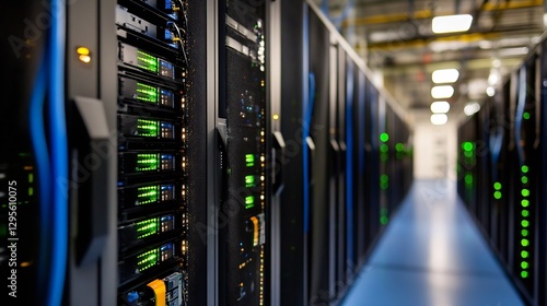 Modern Data Center Infrastructure with Server Racks and LED Lights in a High Tech Environment : Generative AI