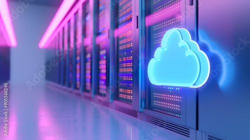 Modern data center server rack with cloud computing symbol. Digital storage infrastructure and technology concept.