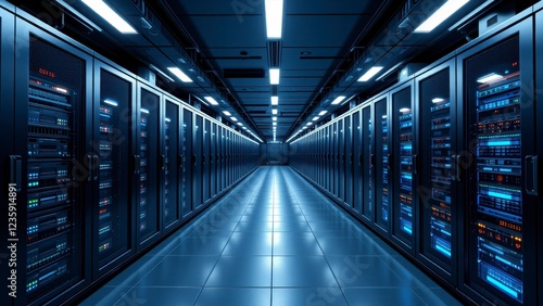 Modern Data Center Server Room Interior Rows of Network Servers and IT Infrastructure
