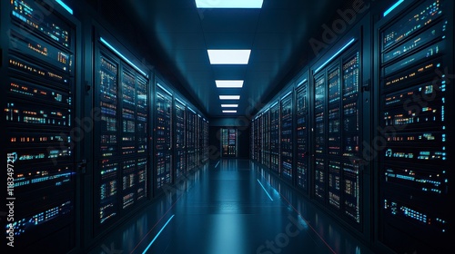Modern Data Center Server Room Interior Rows of Network Servers and Technology Infrastructure