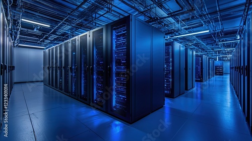 Modern Data Center Server Room Technology Blue Lighting Network Infrastructure