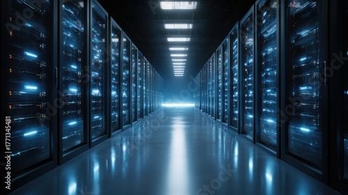 Modern data center server room with blue glowing lights and rows of racks
