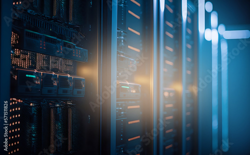 Modern data center With multiple rows operational server with Super computer room, neon color. Generation AI