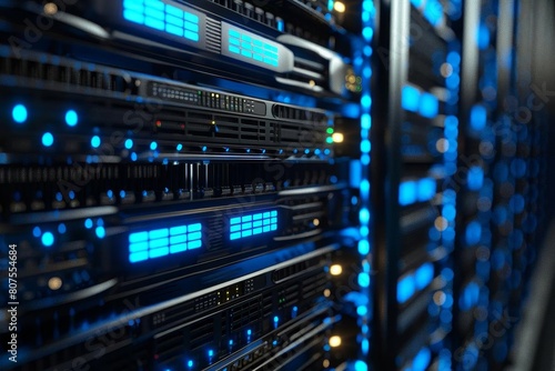 Modern data center with servers and blue light emphasizing advanced IT infrastructure